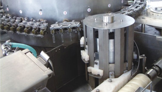 本機(jī)采用8~16工位步進(jìn)式傳輸系統(tǒng),桌面式結(jié)構(gòu),自動(dòng)完成從絞龍進(jìn)瓶、前沖氮(或沖氣)、灌裝、后沖氮、預(yù)熱、拉絲封口到出瓶的全套生產(chǎn)過(guò)程。本機(jī)既能單機(jī)使用,也能與立式超聲波清洗機(jī)、殺菌干燥機(jī)組成聯(lián)動(dòng)線使用。
