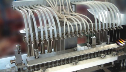本機(jī)采用直線間歇式灌裝及封口。來(lái)自滅菌干燥機(jī)的安瓿瓶通過(guò)進(jìn)瓶傳輸帶送至灌裝封口機(jī)絞龍部位,絞龍將無(wú)序狀態(tài)的安瓿瓶整理成有序的分離狀態(tài),并將安瓿瓶逐個(gè)地推進(jìn)至進(jìn)瓶撥輪,進(jìn)瓶撥輪連續(xù)將安瓿瓶遞交給前行走梁部件,前行走梁部件再將安瓿瓶連續(xù)運(yùn)動(dòng)轉(zhuǎn)變?yōu)殚g歇運(yùn)動(dòng)方式送至中間行走梁然后將安瓿按步進(jìn)方式依次送至下列5個(gè)工位:前充氮、灌液、后充氮、預(yù)熱、拉絲封口工位。在充氮工位,可以根據(jù)用戶(hù)各自產(chǎn)品的需要自行取舍,前充氮工位可設(shè)定為沖壓縮空氣,也可設(shè)定為沖其它惰性氣體,后充氮工位則設(shè)定為沖惰性氣體;在灌液工位,多個(gè)玻璃柱塞泵通過(guò)灌針將藥液注入安瓿,各灌裝泵裝量可通過(guò)調(diào)節(jié)手輪來(lái)調(diào)整;在預(yù)熱工位,安瓿瓶被火嘴吹出的液化氣與氧氣的混合燃燒氣體加熱,同時(shí)在滾輪的作用下產(chǎn)生自旋運(yùn)動(dòng),在拉絲封口工位,安瓿頂部進(jìn)一步受熱軟化被拉絲夾拉絲封口,封好口后的安瓿瓶經(jīng)出瓶撥輪被推入接瓶盤(pán)中,還可以根據(jù)客戶(hù)的要求配備氫氧混和氣作為燃?xì)狻?br />